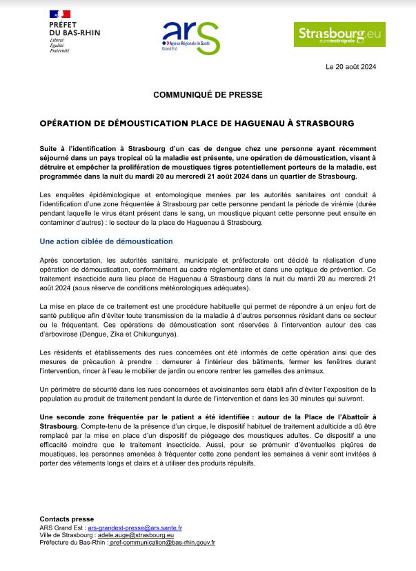 Strasbourg, le 20 août 2024 – Face à la découverte d’un cas autochtone de dengue à Strasbourg, les autorités sanitaires, municipales et préfectorales ont décidé de mettre en place une opération de démoustication exceptionnelle dans la nuit du mardi 20 au mercredi 21 août. Cette mesure vise à prévenir toute propagation de la maladie.