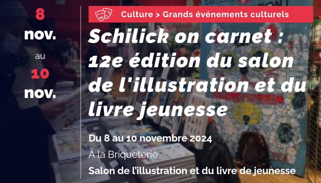 Du 8 au 10 novembre 2024, Schilick on Carnet revient à la Briqueterie de Schiltigheim pour un week-end dédié à l’illustration et à la littérature jeunesse. Ce rendez-vous invite petits et grands à découvrir des univers graphiques uniques, dans une ambiance festive et conviviale où les livres prennent vie.