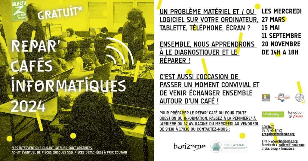 Organisé par le collectif Horizome, en partenariat avec Équilateral, Le Galet CSC Hautepierre et Jeep Hautepierre, cet événement s’adresse à toutes et tous. Que vous souhaitiez diagnostiquer un problème matériel ou logiciel, trouver des solutions pratiques, ou simplement découvrir les rouages de l’informatique autour d’un café, ce rendez-vous est fait pour vous.