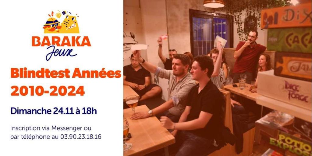 Pour les amateurs de musique et de compétition amicale, le Baraka Jeux invite les équipes à s’affronter lors d’un blindtest spécial Années 2010-2024, dimanche 24 novembre à 18h. Une soirée idéale pour tester vos connaissances musicales récentes tout en passant un bon moment avec des amis ou en rencontrant de nouveaux participants. À la clé, des bières et des shots pour les deux meilleures équipes. Les inscriptions se font directement via Messenger.
