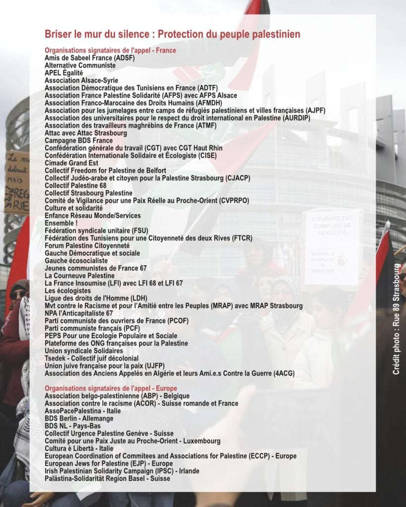 Pour les participants, ce rassemblement sera l’occasion de « briser le mur du silence » autour de la situation en Palestine et de rappeler à l’Union européenne son devoir d’agir pour protéger les droits humains fondamentaux.