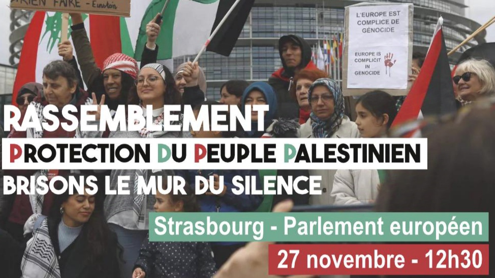 Le mercredi 27 novembre à 12h30, un grand rassemblement est organisé devant le Parlement européen à Strasbourg afin de dénoncer les violences et les persécutions subies par le peuple palestinien. Cette mobilisation, soutenue par plusieurs associations et militants internationaux, vise à interpeller l’Union européenne sur son rôle dans le silence et l’inaction face à la situation en Palestine.