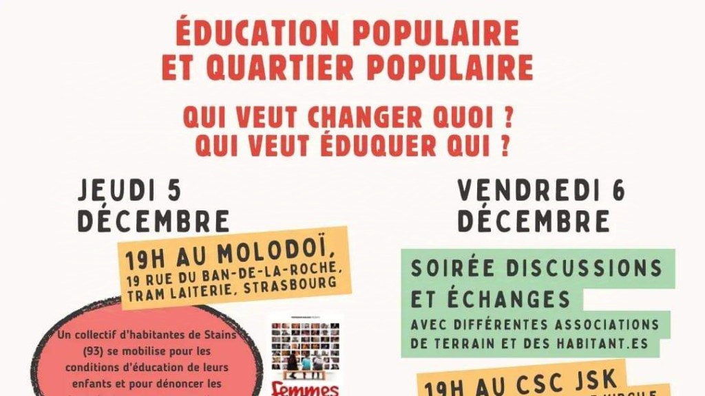 Le deuxième jour de l’événement se tiendra au Centre Social et Culturel Camille Claus (41 Rue Virgile, Koenigshoffen, Strasbourg). Ce vendredi 6 décembre, à partir de 19h, les échanges s’intensifieront autour de la question : « Éducation populaire et quartier populaire : Qui veut changer quoi ? Qui veut éduquer qui ? »