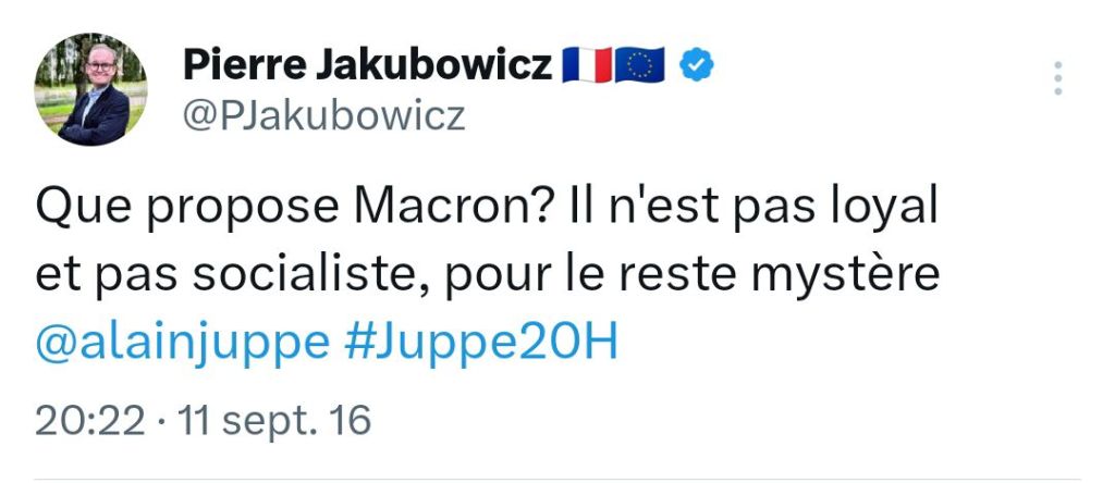 Plus surprenant encore, en 2016, Jakubowicz critiquait directement Emmanuel Macron, qu’il qualifiait de « pas loyal » et « pas socialiste », tout en s’interrogeant sur le flou de ses propositions. Durant cette période, Pierre Jakubowicz était un soutien de Jean-Pierre Raffarin, avant de se tourner vers Emmanuel Macron quelques années plus tard.