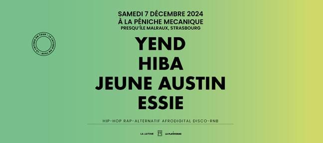 Plongez dans une expérience musicale unique avec Yend, Hiba, Jeune Austin et Essie, des artistes à la croisée des styles rap, trap et RnB. Leur créativité et leur énergie promettent un concert inoubliable, parfait pour les amateurs de sons urbains et de découvertes artistiques. Cette soirée s’annonce comme un rendez-vous incontournable pour vibrer au rythme des talents émergents de la scène musicale contemporaine.