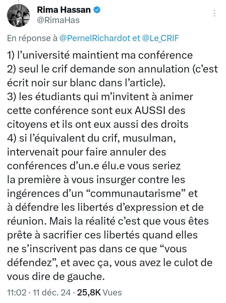 Rima Hassan n’a pas tardé à répliquer en défendant sa position et en critiquant l’attitude de Pernelle Richardot. Elle a déclaré : « 1) L’université maintient ma conférence. 2) Seul le CRIF demande son annulation (c’est écrit noir sur blanc dans l’article). 3) Les étudiants qui m’invitent à animer cette conférence sont eux AUSSI des citoyens et ils ont eux aussi des droits. 4) Si l’équivalent du CRIF, musulman, intervenait pour faire annuler des conférences d’un.e élu.e, vous seriez la première à vous insurger contre les ingérences d’un “communautarisme” et à défendre les libertés d’expression et de réunion. Mais la réalité, c’est que vous êtes prête à sacrifier ces libertés quand elles ne s’inscrivent pas dans ce que “vous défendez”, et avec ça, vous avez le culot de vous dire de gauche. »