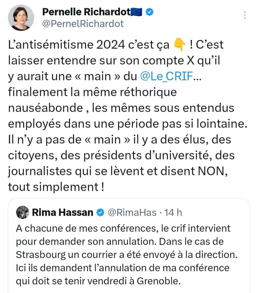 Cette déclaration a provoqué une réponse immédiate de Pernelle Richardot, qui a dénoncé ce qu’elle considère comme des insinuations inquiétantes : « L’antisémitisme 2024, c’est ça ! C’est laisser entendre sur son compte X qu’il y aurait une “main” du @Le_CRIF… Finalement la même rhétorique nauséabonde, les mêmes sous-entendus employés dans une période pas si lointaine. Il n’y a pas de “main”, il y a des élus, des citoyens, des présidents d’université, des journalistes qui se lèvent et disent NON, tout simplement ! »