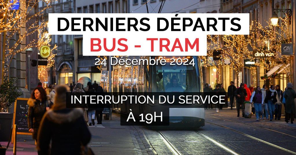 Le soir du réveillon de Noël, le réseau de transports publics (bus et tram) s’interrompra à partir de 19h00. À partir de cet horaire, aucun bus ni tram ne circulera dans l’ensemble de l’agglomération strasbourgeoise. Les derniers départs des trams auront lieu depuis le centre-ville :