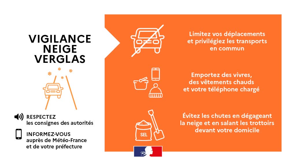 - Sur la route : Si vous devez absolument vous déplacer, assurez-vous que votre véhicule est équipé (pneus neige, chaîne, gilet de sécurité).
