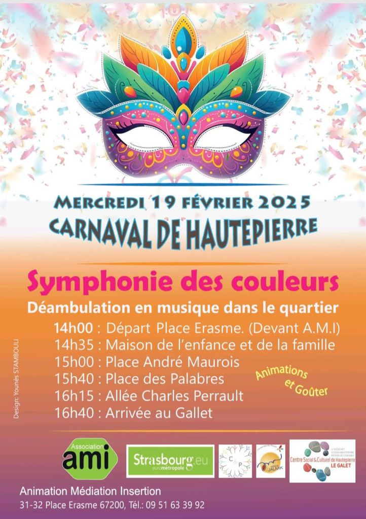 Le Carnaval de Hautepierre revient cette année avec une édition haute en couleur ! Organisé par l’Association AMI, cet événement festif se déroulera le mercredi 19 février 2025, à partir de 14h, au départ du 31/32 place Erasmus, 67200 Strasbourg.