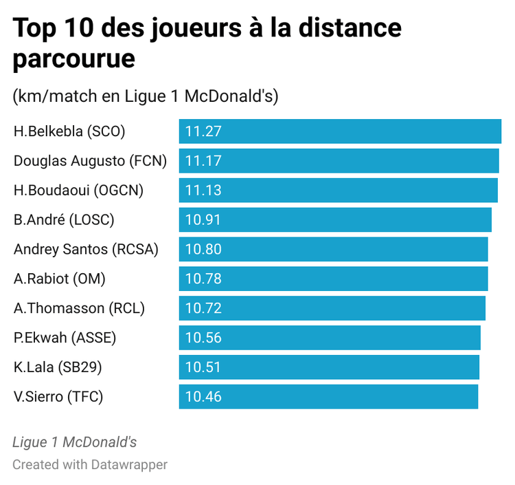 Autre pépite du Racing, Diego Moreira se hisse dans le top 3 des joueurs les plus actifs de Ligue 1. Mieux encore, le Portugais est le seul joueur à avoir dépassé la barre des 10 km parcourus uniquement en sprint cette saison.