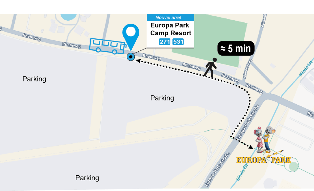 - Un nouvel arrêt directement au Camp Resort d’Europa-Park, situé à seulement 5 minutes à pied de l’entrée principale. Ce changement facilite l’accès au parc et évite aux voyageurs un détour inutile.