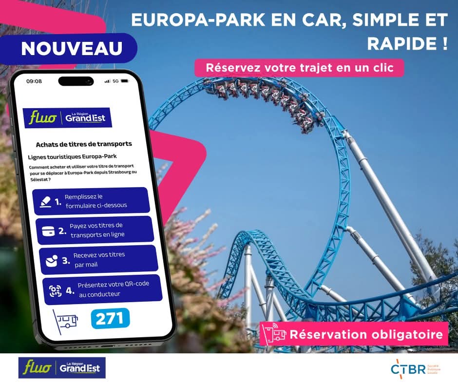 À l’occasion de la réouverture d’Europa-Park ce 22 mars 2025, Fluo Grand Est et la CTBR annoncent la mise en service d’une nouvelle plateforme de réservation en ligne dédiée aux trajets en car vers le célèbre parc d’attractions situé en Allemagne. Une solution pratique et accessible pensée pour les Strasbourgeois et les habitants du Grand Est désireux de profiter pleinement de leur journée au parc sans se soucier du trajet.