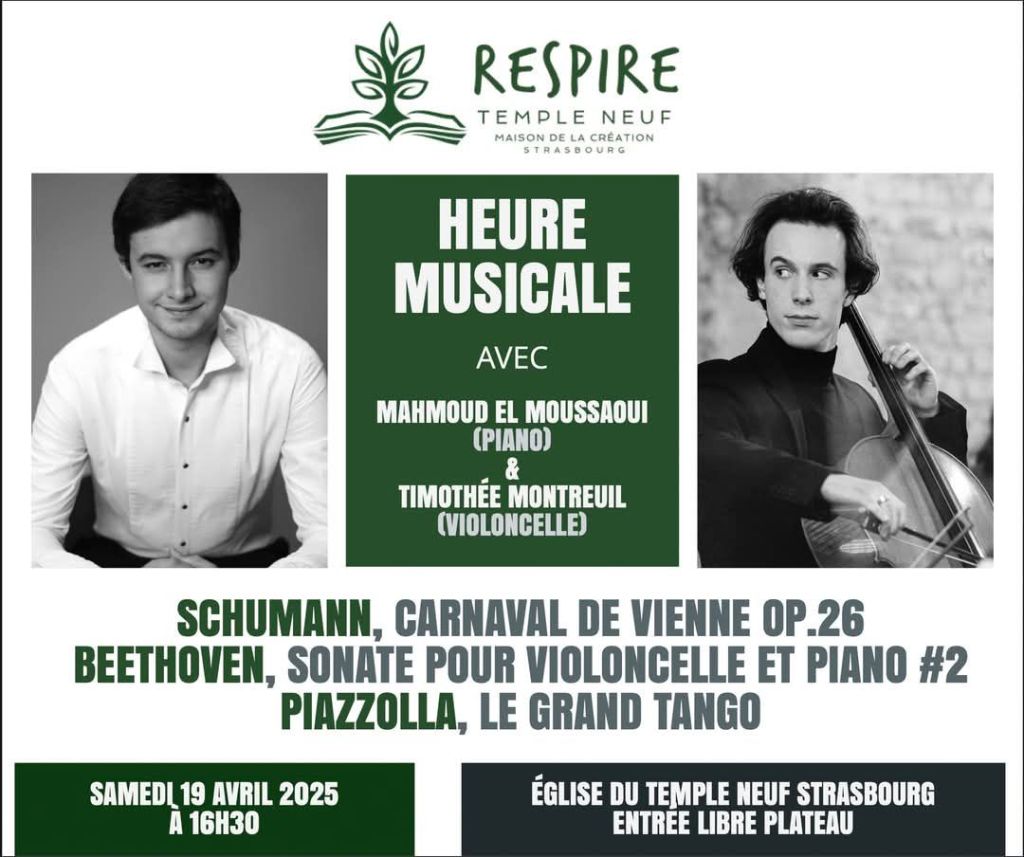 Ce samedi 19 avril, à 16h30, l’église du Temple Neuf accueillera un concert de musique classique d’une rare qualité. Ce récital, à l’entrée libre, promet de séduire les mélomanes avec un programme ambitieux, composé d’œuvres de Schumann, Beethoven et Piazzolla, interprétées par deux jeunes talents prometteurs : Mahmoud El Moussaoui, au piano, et Timothée Montreuil, au violoncelle.