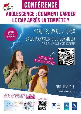 Comment accompagner au mieux son adolescent dans cette période souvent mouvementée qu’est l’adolescence ? C’est la question à laquelle tentera de répondre une conférence gratuite organisée par le Pôle Enfance Jeunesse de la Communauté de Communes du Pays de Barr, ce mardi 29 avril 2025 à la Salle des fêtes de Goxwiller.