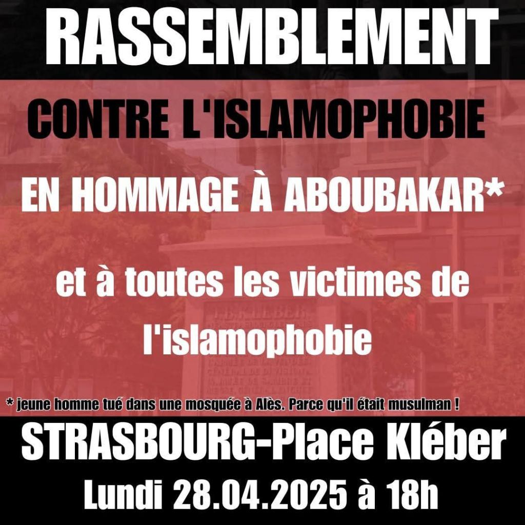 Ce lundi 28 avril, un rassemblement est organisé à 18h, place Kléber à Strasbourg, pour rendre hommage à Aboubakar, assassiné vendredi dernier dans la mosquée de La Grand-Combe, dans le Gard. Le meurtre islamophobe a profondément choqué la communauté musulmane. Le procureur de la République a évoqué l’hypothèse d’un acte motivé par la haine religieuse, après que des vidéos ont montré le suspect assénant plusieurs coups de couteau à la victime.