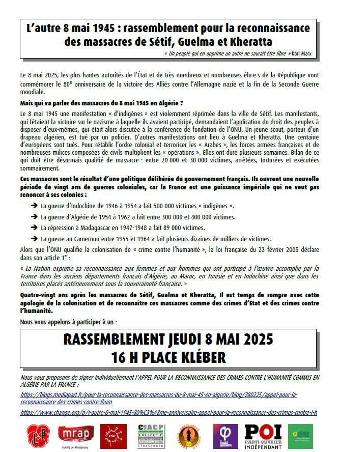 Plus tard dans la journée, à 18h, un autre rassemblement est prévu place Kléber pour rendre hommage aux victimes des massacres coloniaux de Sétif, Guelma et Kherrata. Les organisateurs rappellent que le 8 mai 1945, alors que la France célébrait la victoire contre le nazisme, l’armée coloniale réprimait dans le sang des manifestations en Algérie, faisant, selon eux, plus de 45 000 morts.