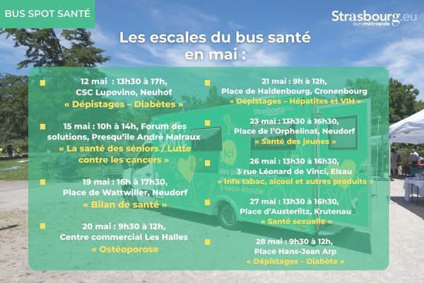 Ce mois-ci, le Bus Spot Santé s’arrêtera dans huit quartiers de Strasbourg avec des actions adaptées aux enjeux locaux :