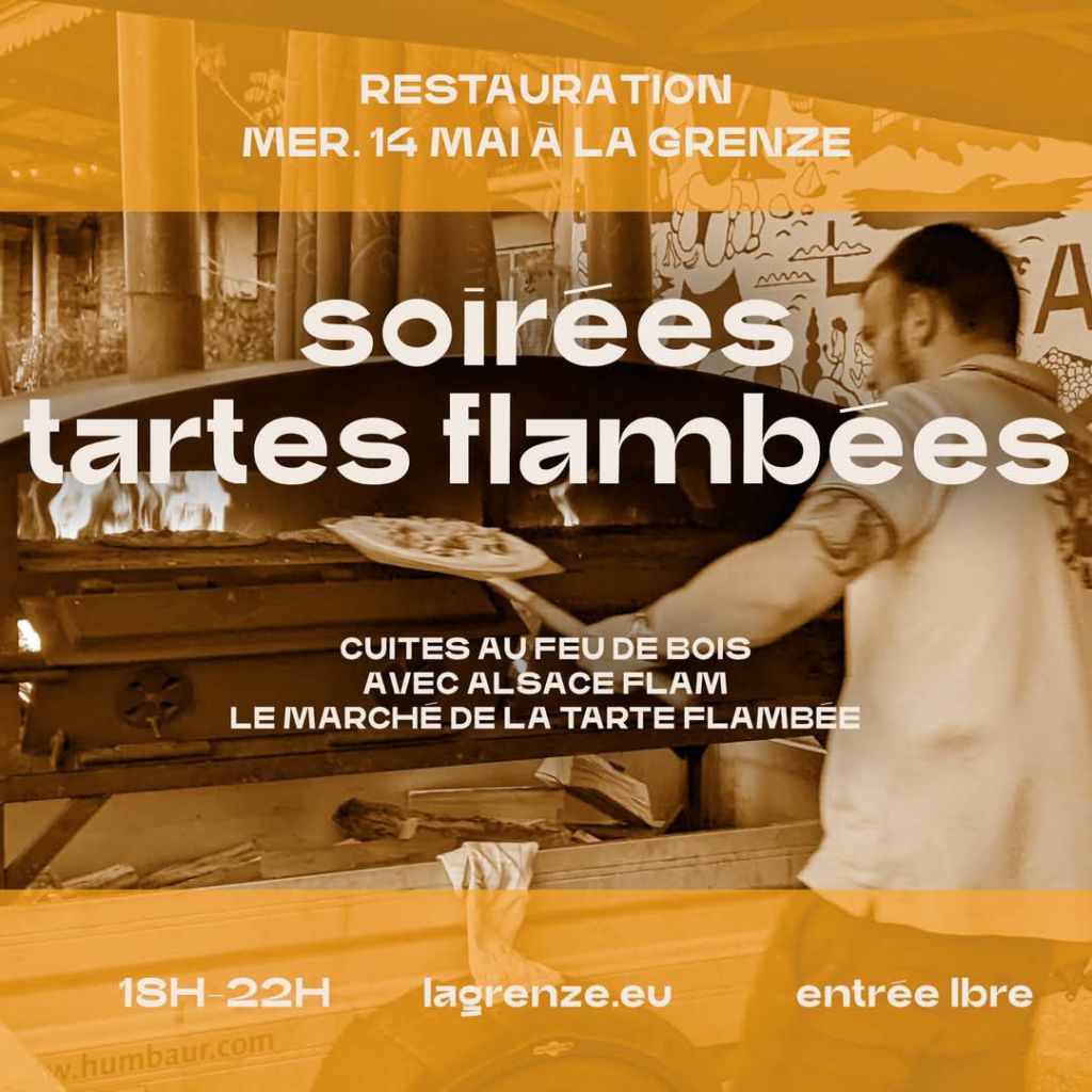 Enfin, la soirée se prolongera autour d’un incontournable de la gastronomie alsacienne : la tarte flambée. Cuites au feu de bois grâce au four géant installé par Le Marché de la Tarte Flambée de Marlenheim, elles seront servies sur la grande terrasse de La Grenze. Cinq recettes sont proposées à des prix abordables :