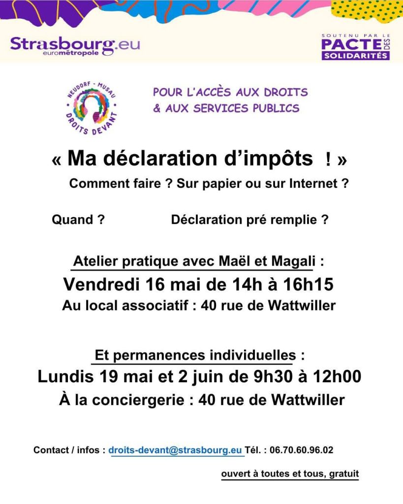 Cet atelier, animé par Maël et Magali, se tiendra le vendredi 16 mai de 14h à 16h15 au local associatif situé au 40 rue de Wattwiller. Il proposera une approche concrète pour répondre aux nombreuses questions que se posent les contribuables : déclaration papier ou numérique ? Comment vérifier une déclaration pré-remplie ? Quelles démarches effectuer en cas d’erreur ?