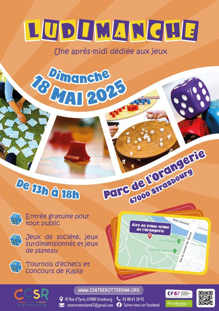 Ce dimanche 18 mai, les allées du Parc de l’Orangerie s’animeront aux sons des dés qui roulent, des éclats de rire et des cartes que l’on abat. De 13h à 18h, l’événement Ludimanche investit le parc pour une après-midi placée sous le signe du jeu, de la convivialité et du partage, à l’initiative du Centre Rotterdam.