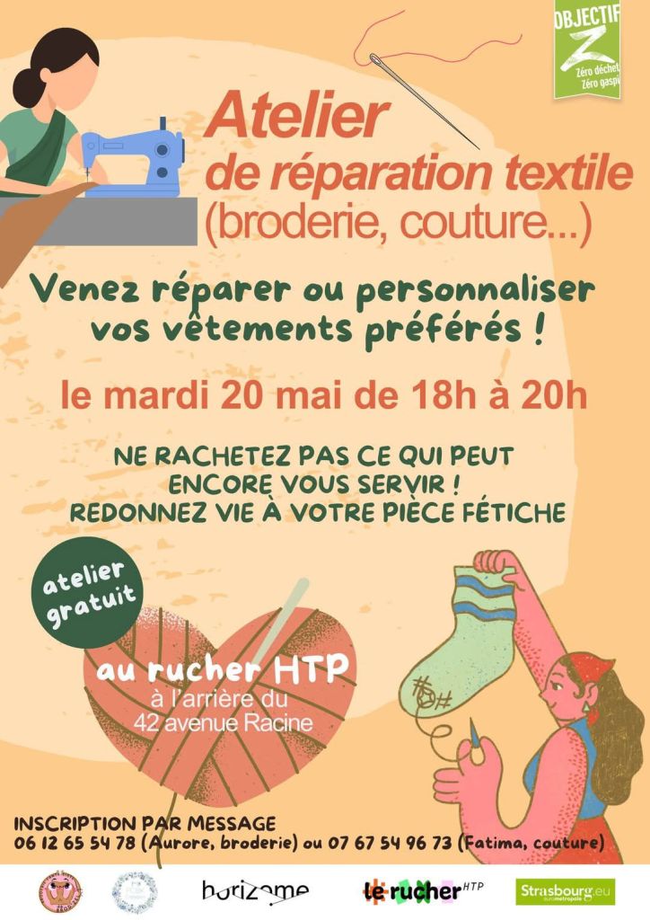 Ce projet fait suite à la cartographie brodée de Hautepierre, un travail collectif porté par Aurore et Fatima, qui mêle art, mémoire du quartier et engagement écologique. Les ateliers sont également l’occasion de rejoindre un groupe WhatsApp dédié à l’upcycling textile, où les participants pourront échanger conseils, idées et retours d’expérience avec les encadrantes.
