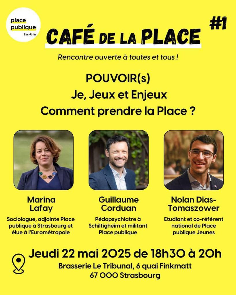 Ce jeudi soir, les Strasbourgeois sont invités à un moment d’échange et de réflexion autour du pouvoir, de ses formes et de ses enjeux, à l’occasion du premier « Café de la Place » organisé par la section bas-rhinoise du mouvement citoyen Place publique. L’événement se tiendra de 18h30 à 20h à la Brasserie Le Tribunal, située au 6 quai Finkmatt, en plein cœur de Strasbourg.