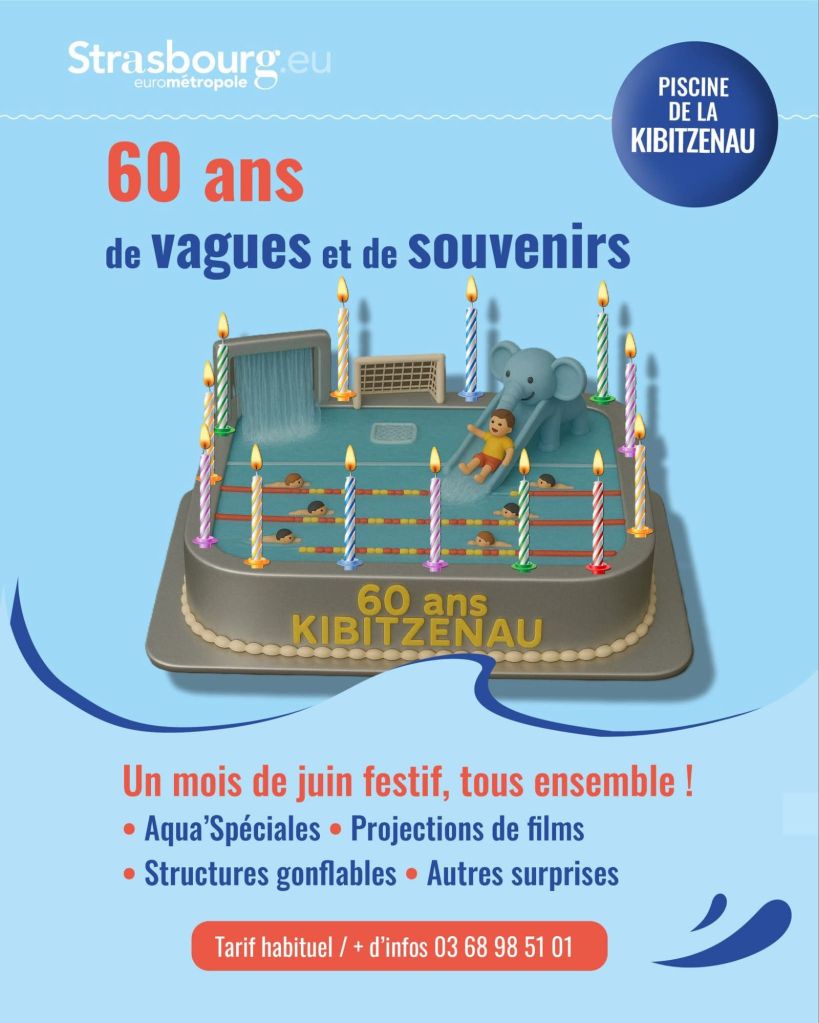 Elle a vu défiler des générations de Strasbourgeois, rythmé les après-midis d’été et accompagné les premières brasses de nombreux enfants : la piscine de la Kibitzenau souffle cette année ses 60 bougies. À cette occasion, la Ville de Strasbourg organise un mois de festivités, du 5 au 29 juin, pour célébrer ce lieu emblématique de la vie locale.
