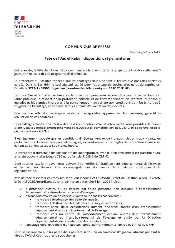 La fête de l’Aïd el-Kébir, prévue cette année à partir du 6 juin 2025, donnera lieu comme chaque année à des abattages rituels d’animaux. Dans un communiqué publié le 31 mai, la préfecture du Bas-Rhin rappelle les règles strictes encadrant ces pratiques pour garantir à la fois la sécurité sanitaire, le bien-être animal et le respect de la législation en vigueur.