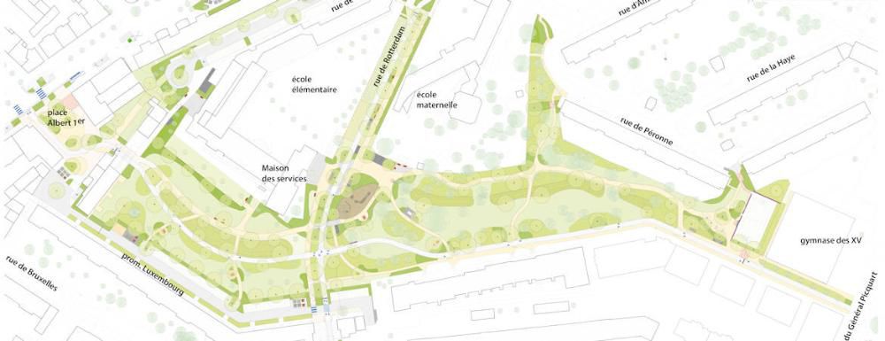 Le projet révolutionne la circulation dans le quartier. La rue de Rotterdam devient piétonne et végétalisée, tandis que 600 mètres linéaires d’aménagements cyclables facilitent les déplacements actifs. La place Albert 1er se transforme en espace exclusivement piéton, créant une respiration urbaine au cœur de la cité.