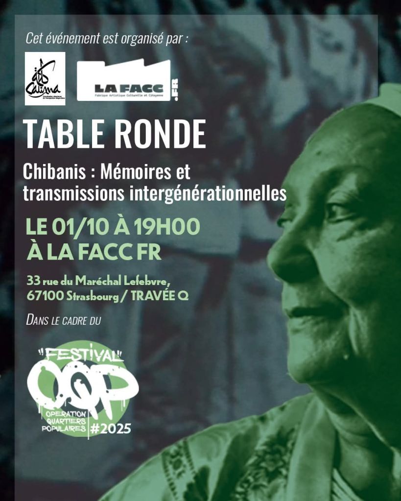 Le même jour à 19h au Calima de la Meinau, une table ronde intitulée « Chibanis, les invisibles : Mémoires et Transmission intergénérationnelle » donnera la parole à ceux qui témoignent d’une mémoire souvent invisibilisée de l’immigration postcoloniale maghrébine en France.