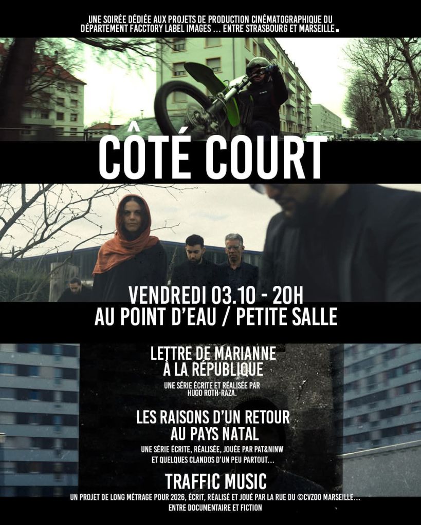 Vendredi 3 octobre à 20h, la soirée « Côté Court » au Point d’Eau mettra en lumière les projets cinématographiques de Facctory Label Images, entre documentaire et fiction, avec notamment des séries tournées entre Strasbourg et Marseille.