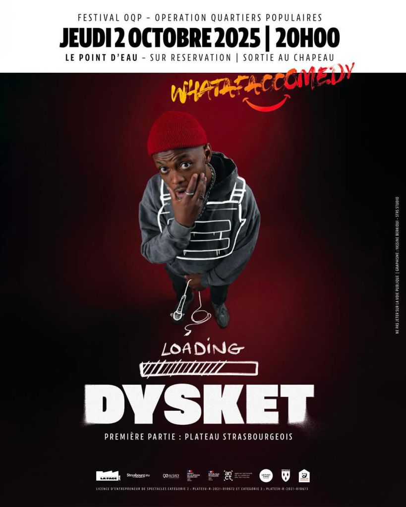 Jeudi 2 octobre à 20h au Point d’Eau, place au rire avec Whatafaccomedy et Dysket dans son premier spectacle « Loading ». Un stand-up à la française mêlant humour tranchant, anecdotes personnelles et regard acéré sur la société, concocté par la Maîtresse de Cérémonie du collectif.