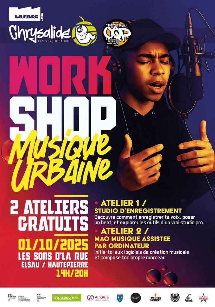 Mercredi 1er octobre de 14h à 20h, le Projet Chrysalide propose des workshops MAO (beatmaking) et studio aux Sons d’La Rue à Elsau/Hautepierre et au Studio Fontaine. Une initiative portée par l’association pour découvrir et créer en musique urbaine, ouverte à tous.