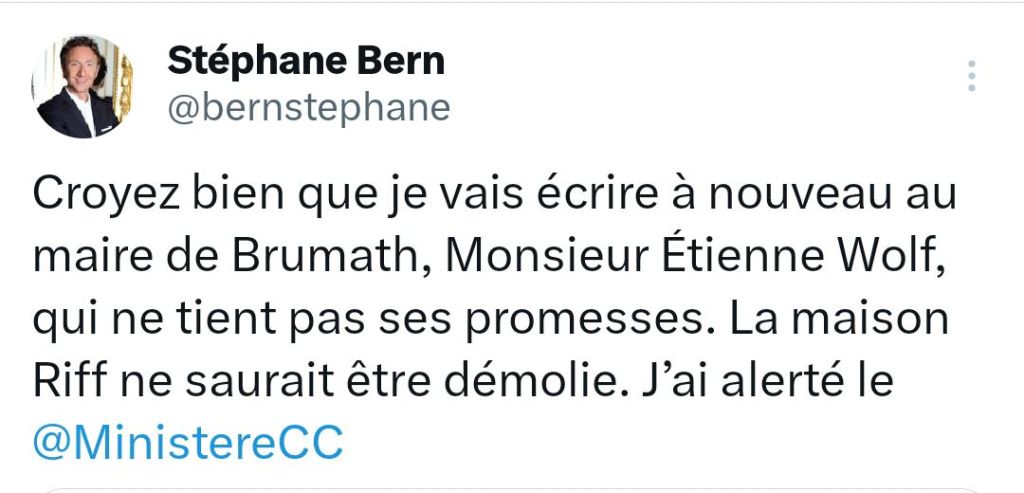 La réponse de Stéphane Bern est sans équivoque : « Croyez bien que je vais écrire à nouveau au maire de Brumath, Monsieur Étienne Wolf, qui ne tient pas ses promesses. La maison Riff ne saurait être démolie. J’ai alerté le @MinistereCC« . L’animateur a directement saisi le ministère de la Culture, escaladant ainsi le dossier au niveau national.