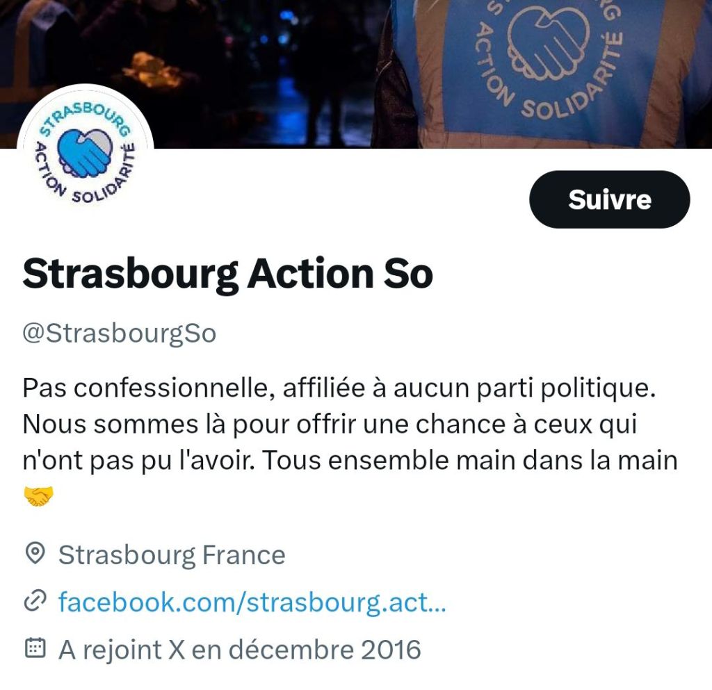 Dans la biographie de son compte Facebook, Strasbourg Action Solidarité revendique fièrement être « pas confessionnelle, affiliée à aucun parti politique« , avec pour slogan : « Nous sommes là pour offrir une chance à ceux qui n’ont pas pu l’avoir. Tous ensemble main dans la main.«