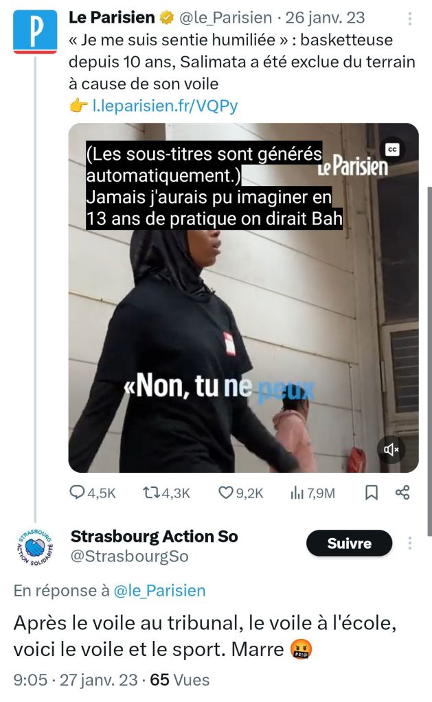En janvier 2023, nouvelle publication virulente : « Après le voile au tribunal, le voile à l’école, voici le voile et le sport. Marre 🤬« .