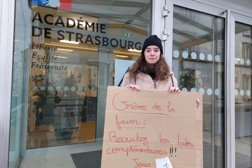 Depuis le 28 octobre 2025, Vanessa Koehler, 25 ans, mène une grève de la faim devant le rectorat de Strasbourg, rue de la Toussaint. Son combat ? Obtenir un poste de titulaire après avoir réussi le concours de professeur des écoles. Classée 11e sur la liste complémentaire de l’académie, elle refuse le statut de contractuelle que lui propose l’institution. Chaque jour, de 7h30 à 18h30, assise sur les escaliers du bâtiment, drapeau français en berne à ses côtés, elle incarne la colère d’une génération d’enseignants confrontée à la précarité et au mépris institutionnel.