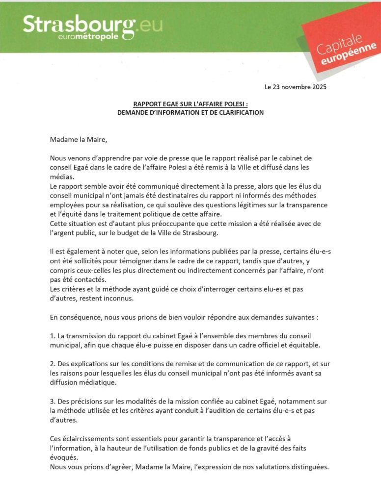 Nos confrères de Rue89Strabourg ont publié ce samedi un article sur le rapport du cabinet Egaé concernant l’affaire Polesi. Ce rapport, commandé et financé par la ville de Strasbourg avec de l’argent public, n’a toujours pas été communiqué aux élus du conseil municipal. Comment la presse a-t-elle pu accéder à ce document alors que les représentants élus en sont privés ? Face à cette situation, plusieurs élus ont adressé une lettre à la maire pour demander l’accès au rapport et des éclaircissements sur les méthodes employées.
