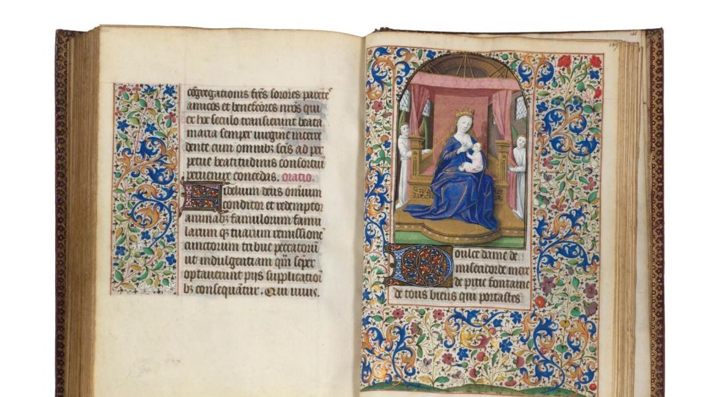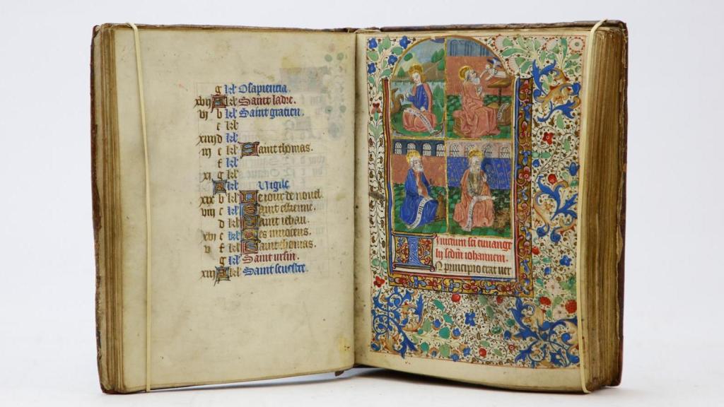 Les prières et psaumes y sont retranscrits en latin avec une élégance calligraphique rare, agrémentés de quelques textes en français. Les scènes religieuses, d’une finesse exceptionnelle, sont encadrées de marges ornées de rinceaux, de fleurs et d’oiseaux. La fraîcheur des couleurs et la richesse des initiales témoignent de la splendeur de l’enluminure médiévale.
