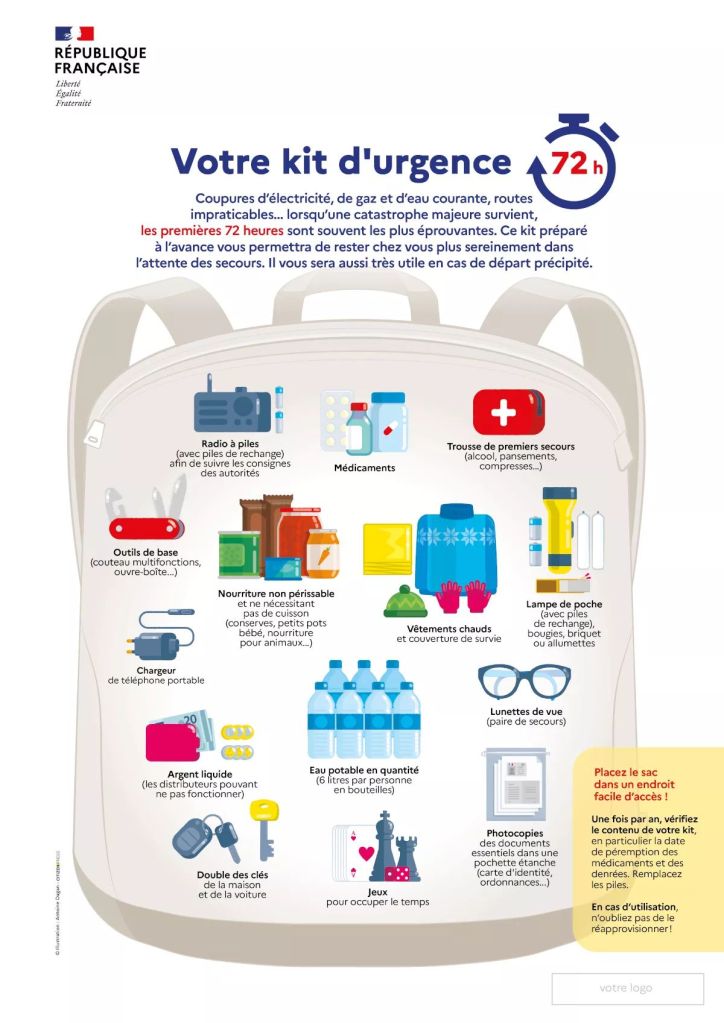 La recommandation centrale du guide est claire : constituez un kit d’urgence permettant de tenir trois jours sans sortir ni dépendre des secours. Le contenu recommandé inclut notamment :
