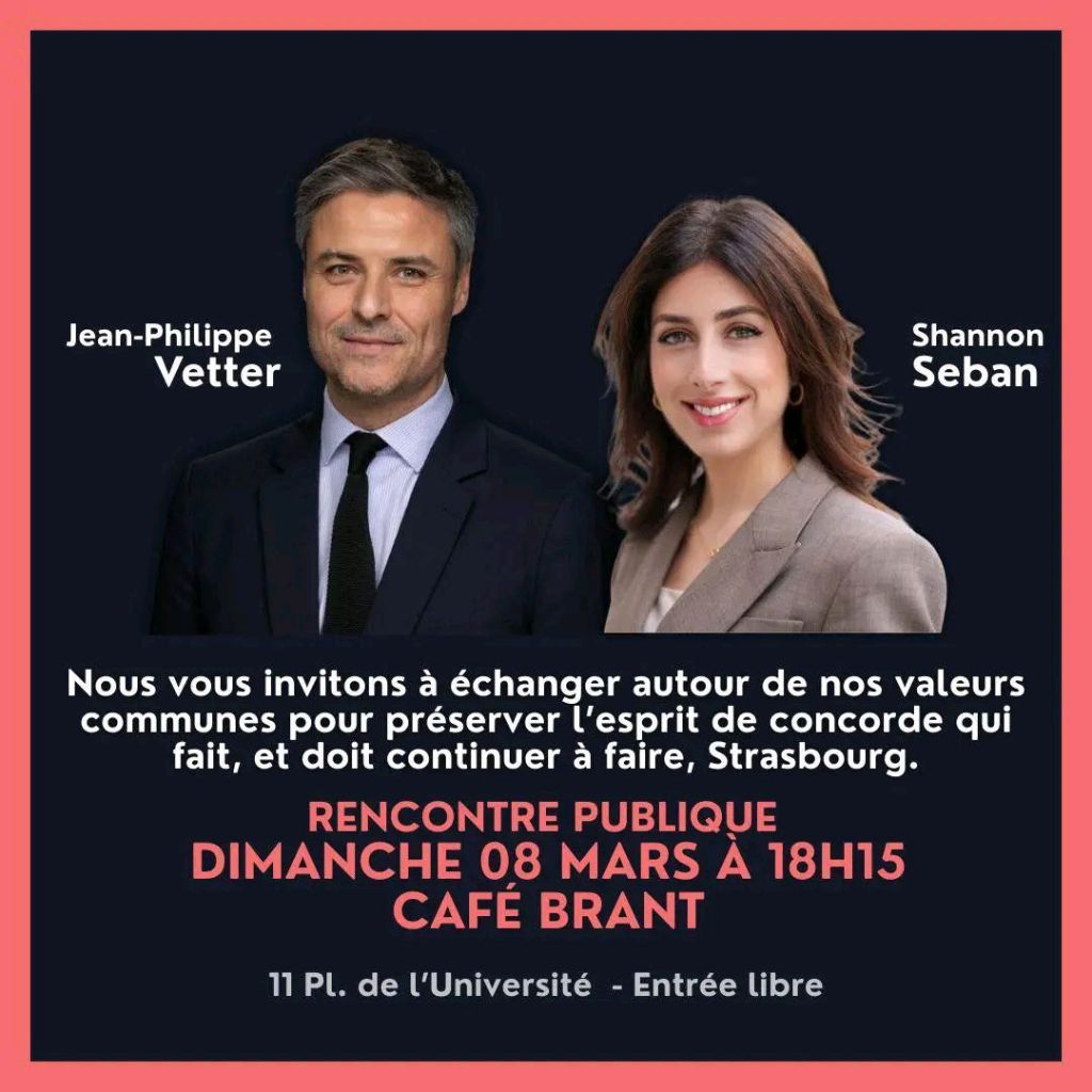 Ce dimanche 8 mars à 18h15, le candidat LR aux municipales 2026 Jean-Philippe Vetter ouvre les portes du Café Brant, 11 place de l’Université, pour un moment d’échange public avec Shannon Seban. L’entrée est libre. Le ton voulu : simple, direct, ancré dans les valeurs républicaines. Mais qui est vraiment cette femme que Vetter présente comme « jeune, engagée et brillante » ?