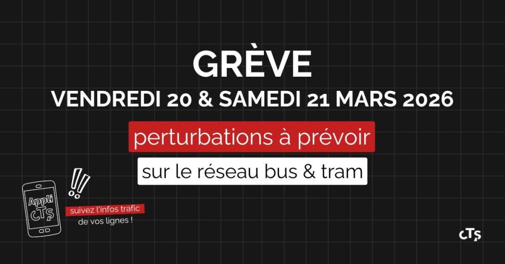 La CTS a publié ses prévisions de trafic pour le vendredi 20 mars 2026, première journée d’un préavis de grève couvrant également le samedi 21 mars. Si le réseau tram reste globalement assuré, les fréquences sont revues à la baisse et plusieurs lignes de bus subissent des modifications sensibles. Voici ce qu’il faut savoir avant de prendre les transports.