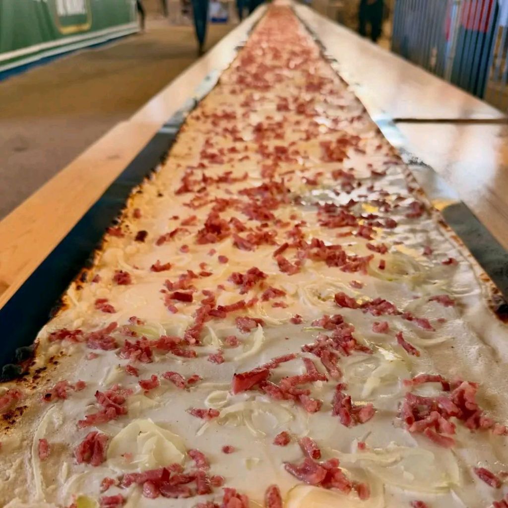 Pour garnir ce ruban géant, les équipes ont mobilisé 50 kg de pâte, 25 kg de lardons, 25 litres de crème fraîche et 20 kg d’oignons. Une recette fidèle à la tradition, en format XXL.