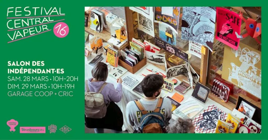 Dans un registre différent, le Festival Central Vapeur tient sa 16ᵉ édition avec le Salon des Indépendant·es, samedi 28 mars (10h–20h) et dimanche 29 mars (10h–19h), au Garage Coop et au CRIC.