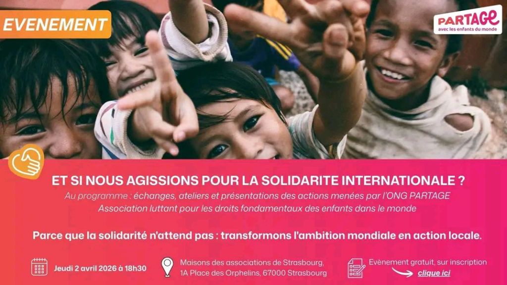 L’ONG PARTAGE – Avec les enfants du monde organise une soirée participative à Strasbourg, le jeudi 2 avril 2026 à 18h30, à la Maison des associations, 1A Place des Orphelins. L’entrée est gratuite, sur inscription.